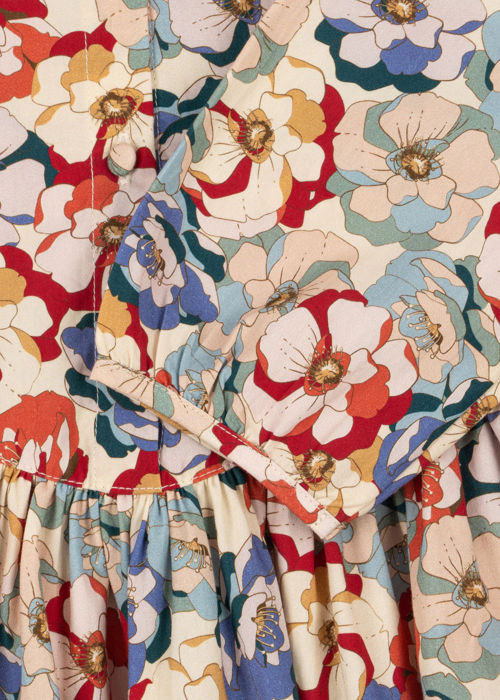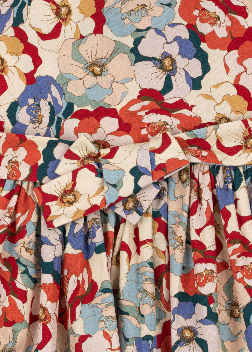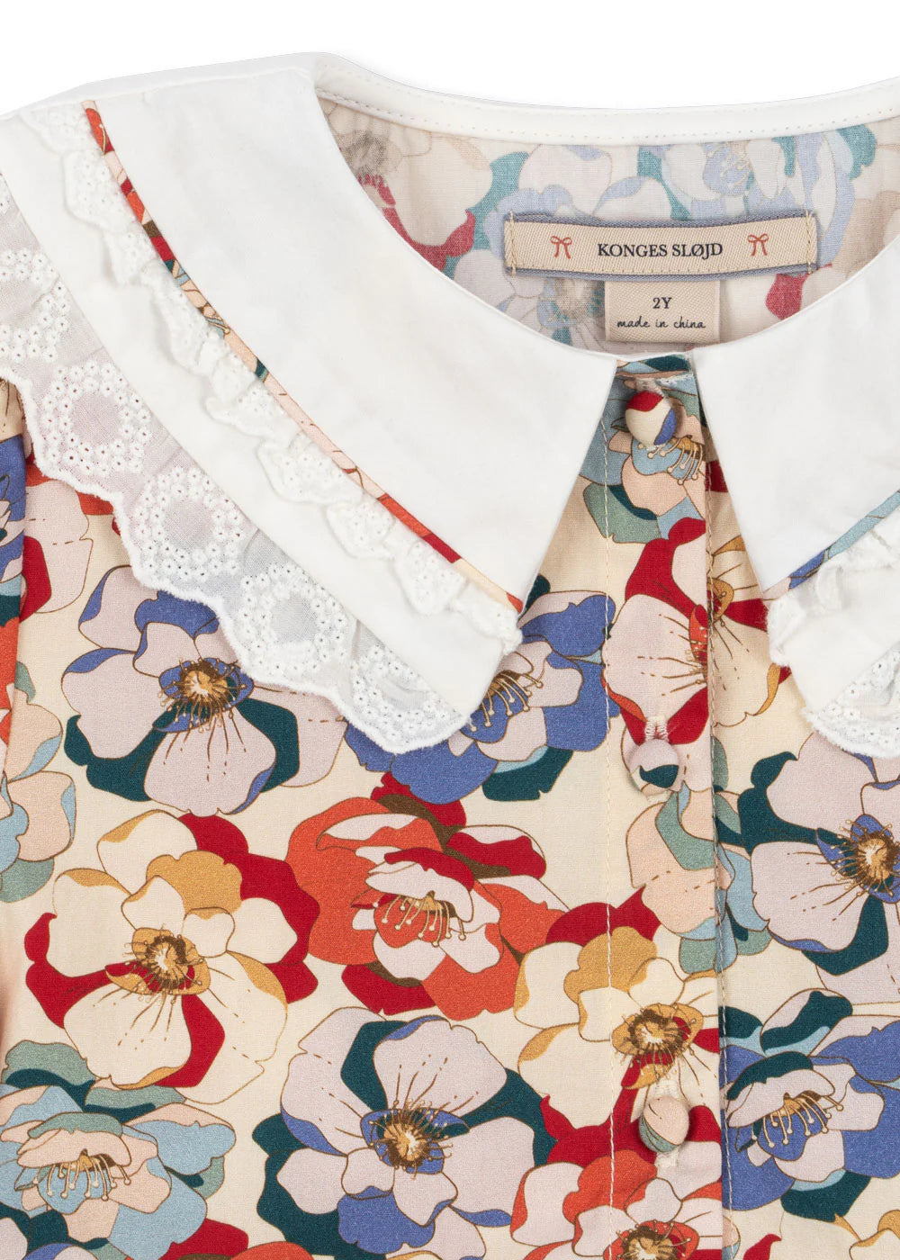 Organic cotton dress with a round lace collar, flared skirt, and puffy sleeves. Designed with fabric covered front buttons and attached straps that tie in the back for a perfect fit. GOTS, Organic, certified by CU1094701