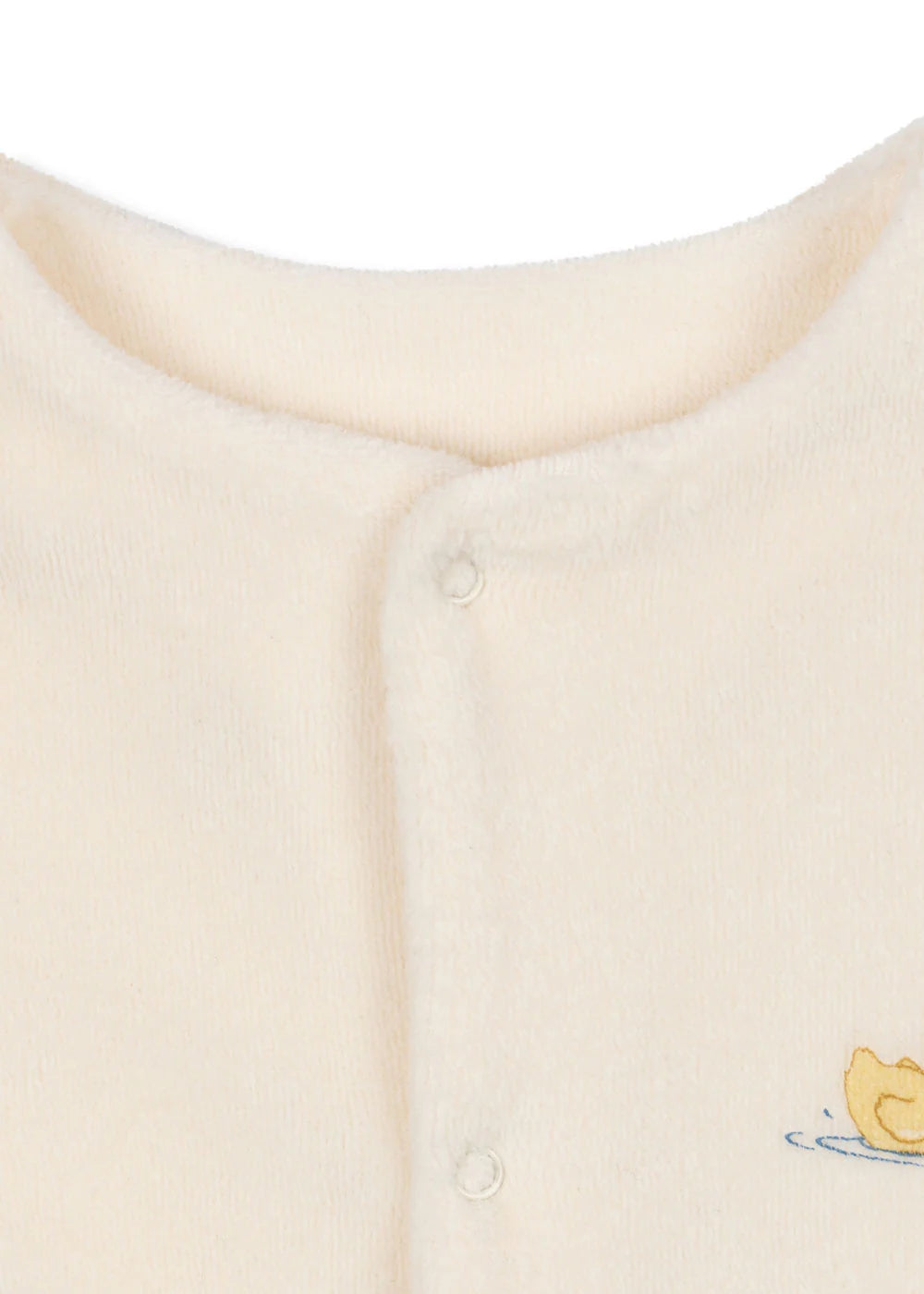 Warm baby onesie made in a comfortable cotton blend with a soft texture. Designed with a full push button opening in front that makes it easy to change your baby. Wear the Elu onesie alone or as a comfy extra layer over thinner cotton basics on cold days. The onesie is also ideal for nap time in the pram or stroller.   GOTS, made with 80% organic materials, certified by CU 1094701