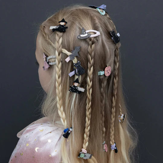 Perfectly sized for tiny tresses, these spooky and sparkly mini clic clacs are just the right mix of frightful and delightful for little ones this Halloween!