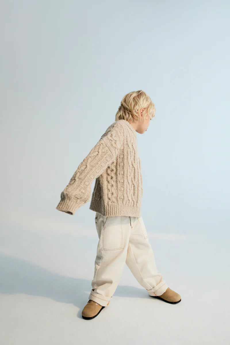 One of our classic knit patterns, reimagined in a sustainable recycled wool quality. Designed with a new textured knit that adds depth and character, this timeless piece combines warmth, comfort, and a modern update to a beloved style.