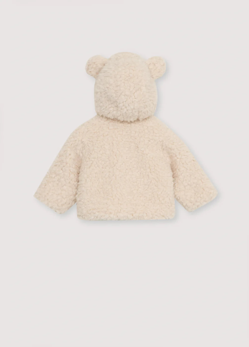 A playful yet stylish coat featuring a hood with fun ear details and a front closure with hidden snaps for a clean finish. The interior is lined with 100% cotton and showcases a subtle leopard print, combining comfort with a touch of whimsy.