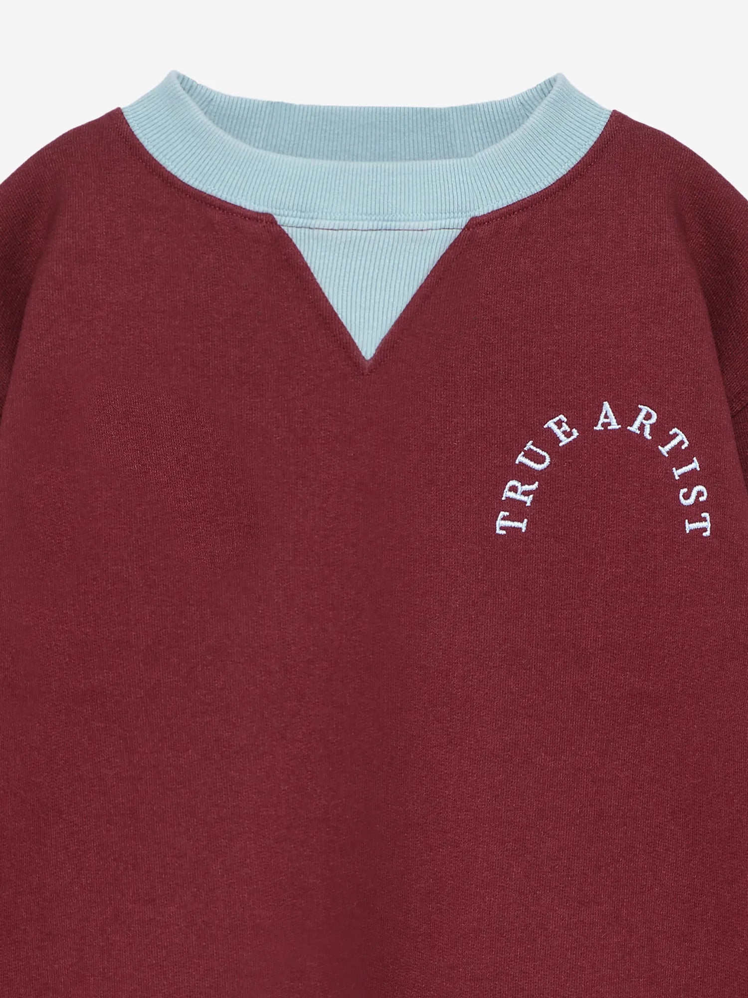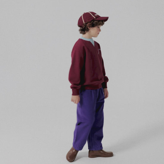 Sweatshirt nº09 in Burgundy Red is made of 98% cotton and 2% elastane fleece and it features a contrast ribbed collar and embroidery on the chest. It is designed with round neck, dropped shoulders and rib on tone at cuffs and bottom. It has a loose fit. Made in Portugal.