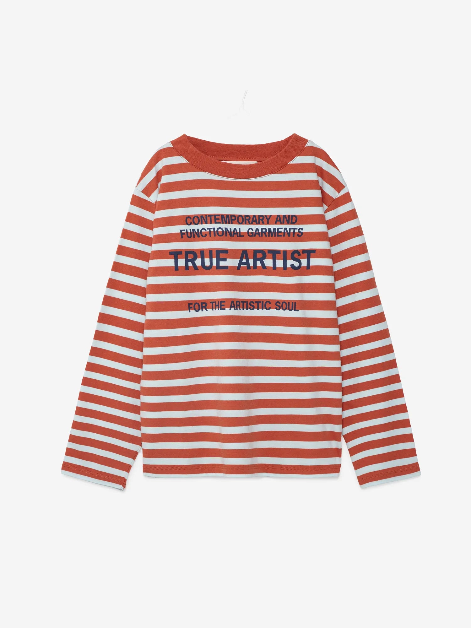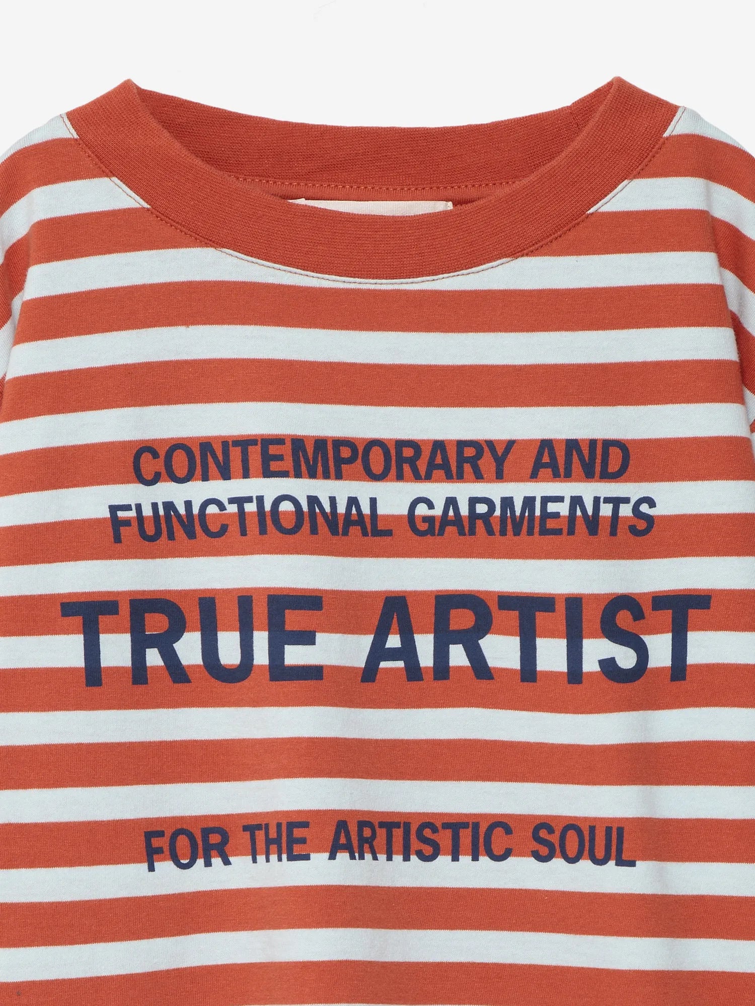 T-shirt nº16 in Blue Glow is made of 100% cotton. This yarn dyed striped t-shirt features our brand slogan printed on the front. It is designed with round neck, long sleeves and dropped shoulders; it has a relaxed fit. Made in Portugal.
