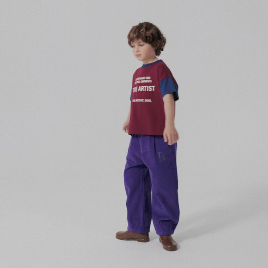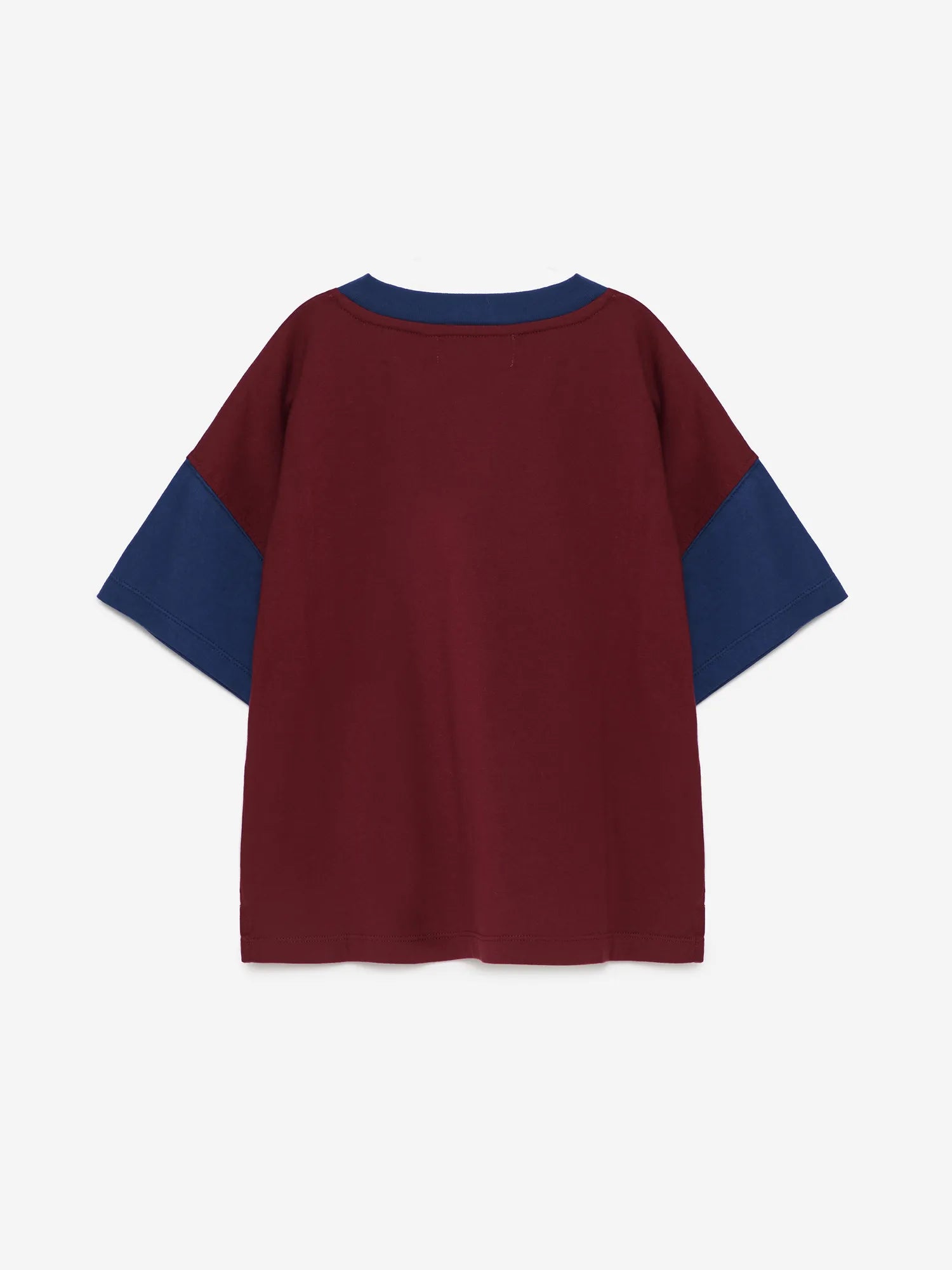 T-shirt nº18 in Burgundy Red is made of 100% organic cotton. This color block t-shirt is designed with sleeves and collar in contrast blue color and it features our brand slogan printed on the front. It has a regular fit. Made in Portugal.