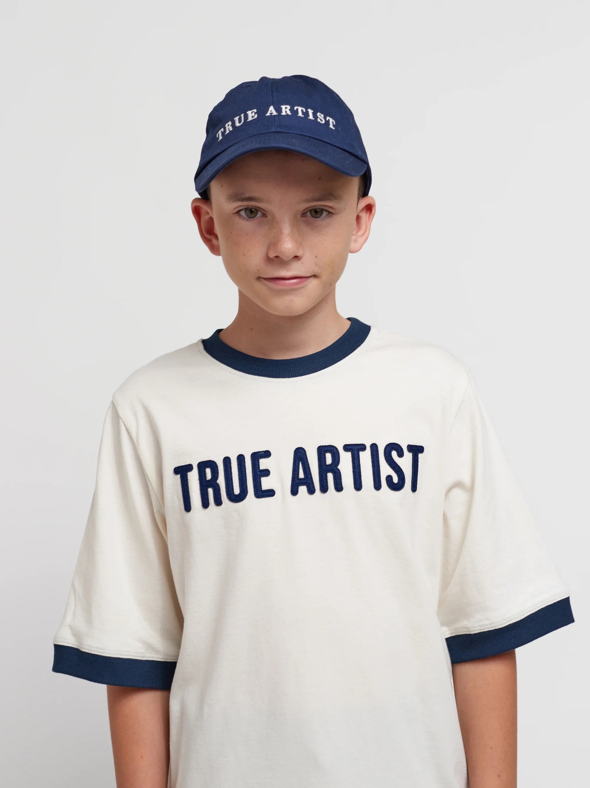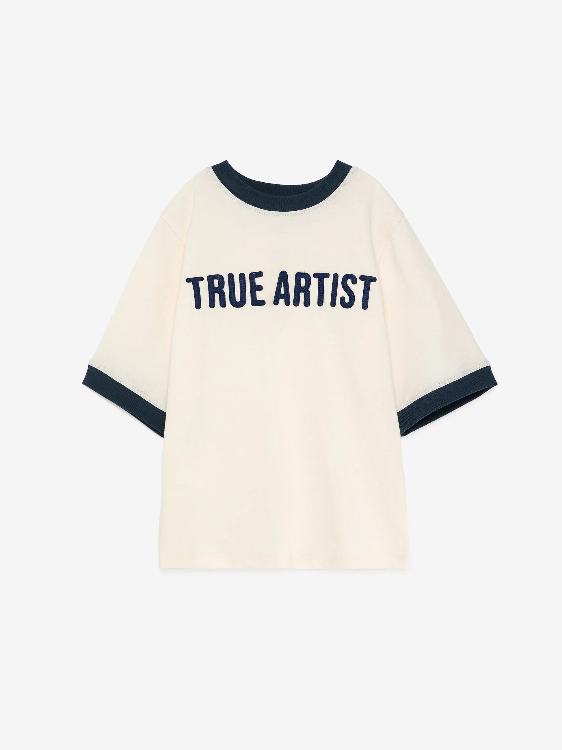 T-shirt nº14 in Ivory White is made of 100% organic cotton and features contrast navy True Artist lettered embroidery patches on the front. This t-shirt is designed with round neck, short sleeves and contrast neck and sleeve edges. It has a straight fit. Made in Spain.